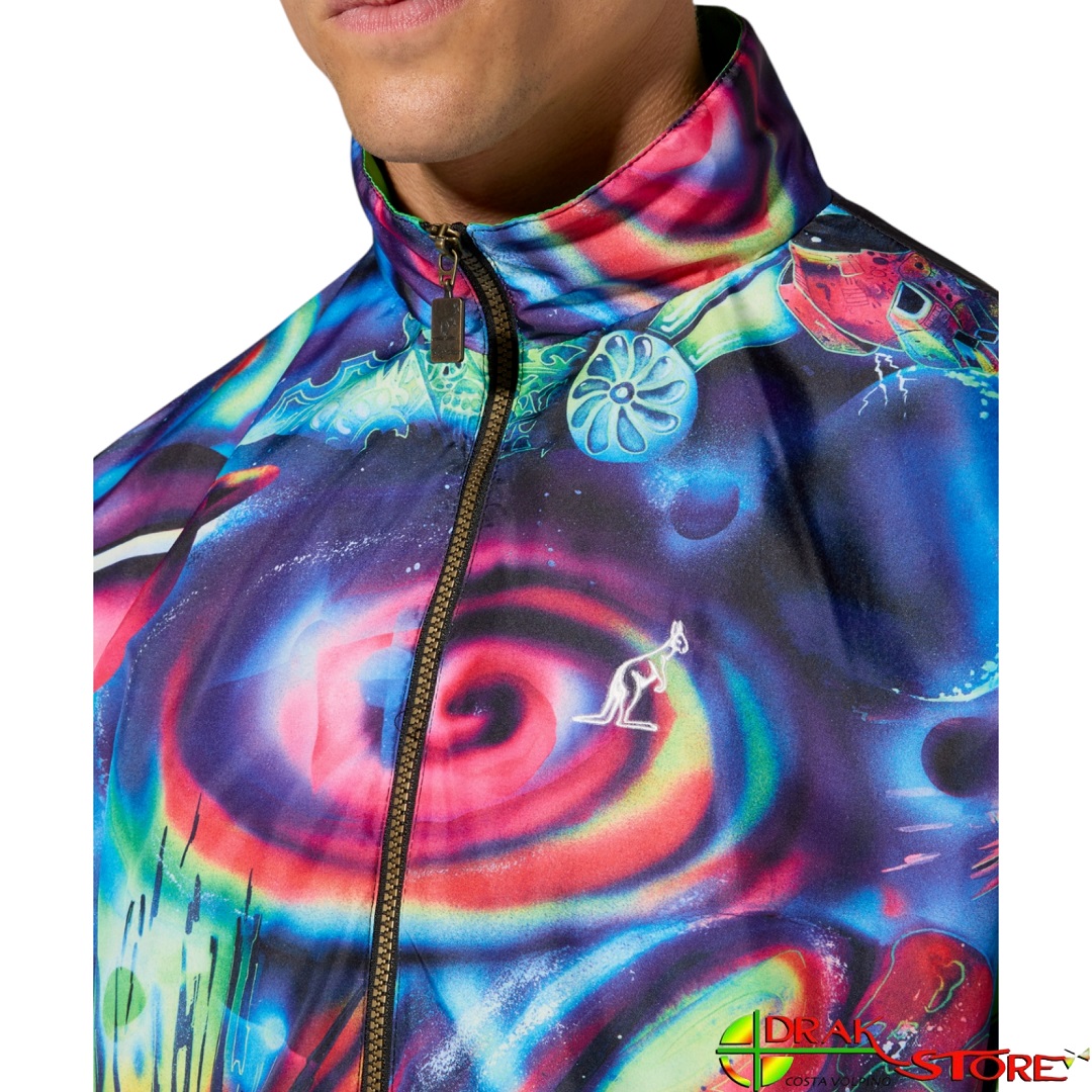 Giacca Australian ideale per gabber, a fantasia pianeti multi color, in tessuto tecnico foderato in rete (che la rende più leggera), logo “canguro” bianco ricamato sul cuore, zip frontale e alle tasche, elastico sul fondo e ai polsi. Composizione 100% poliestere.
