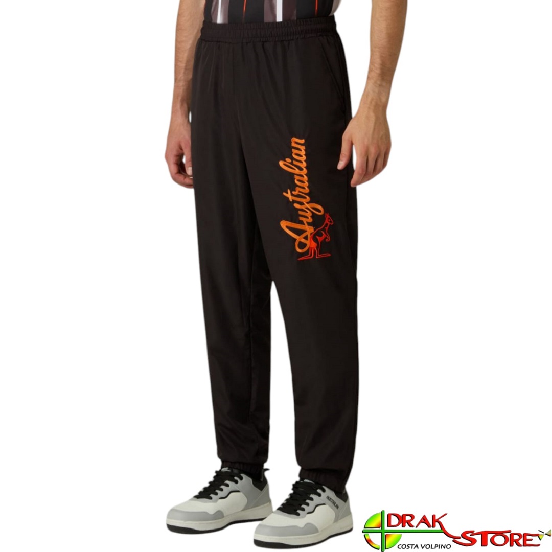 Pantalone Australian in tessuto tecnico foderato in rete morbida (che lo rende più leggero), color nero con scritta bumper “Australian + canguro” ricamata sulla gamba color arancio fluo e rosso, elastico alle caviglie con zip, tasche oblique, elastico in vita con coulisse regolabile. Nuova vestibilità – vedi tabella nelle immagini. Composizione 100% poliestere.