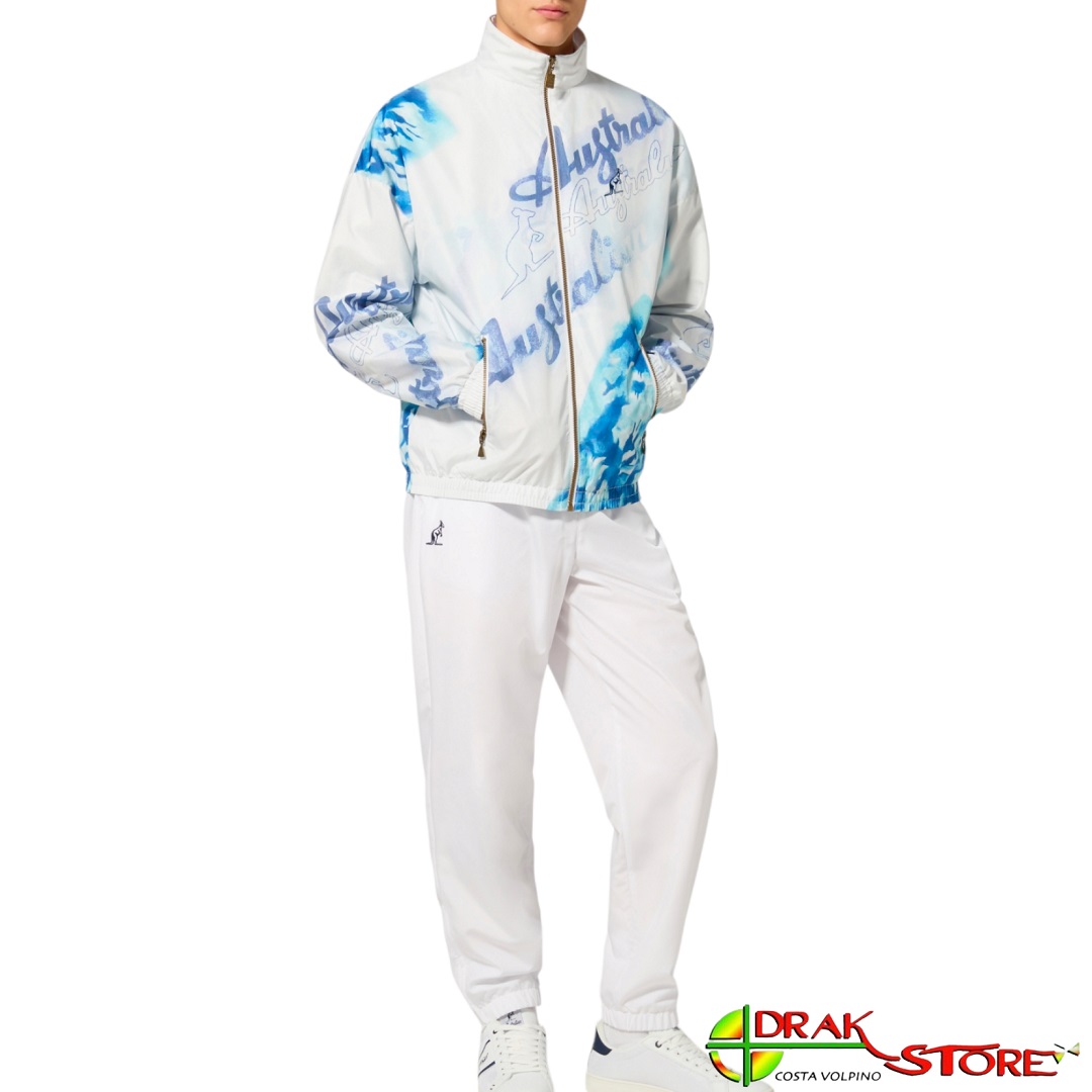 Giacca Australian ideale per gabber, a fantasia scritte bianca e azzurra, in tessuto tecnico foderato in rete (che la rende più leggera), logo “canguro” nero ricamato sul cuore, zip frontale e alle tasche, elastico sul fondo e ai polsi. Composizione 100% poliestere.