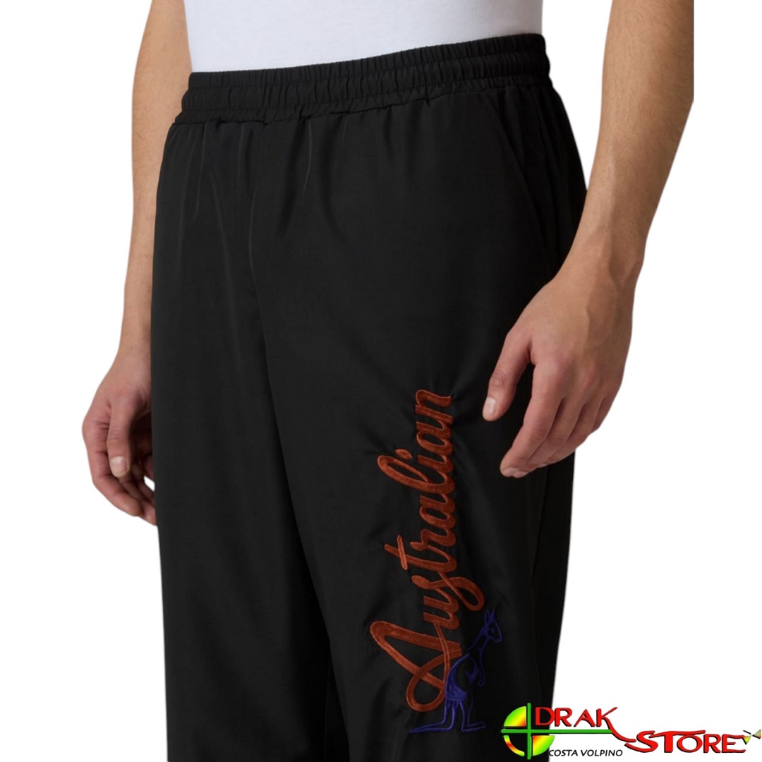 Pantalone Australian in tessuto tecnico foderato in rete morbida (che lo rende più leggero), color nero con scritta bumper “Australian + canguro” ricamata sulla gamba color marrone e bluette, elastico alle caviglie con zip, tasche oblique, elastico in vita con coulisse regolabile. Nuova vestibilità – vedi tabella nelle immagini. Composizione 100% poliestere.