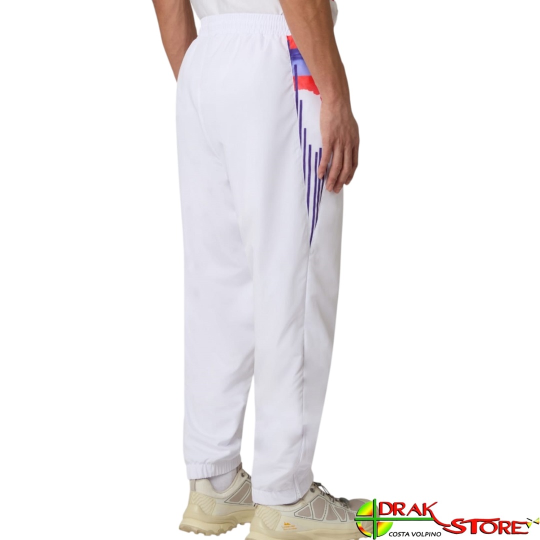 Pantalone Australian in tessuto tecnico “Smash” foderato in rete morbida (che lo rende più leggero), color bianco con inserti a fantasia “Goran”, logo “Canguro” rosso ricamato sotto la tasca, tasche oblique ed elastico alle caviglie con zip, elastico in vita con coulisse regolabile. Composizione 100% poliestere.