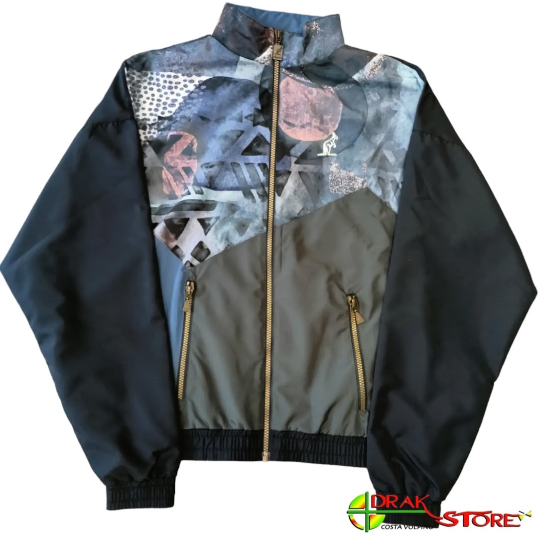 Giacca Australian ideale per gabber, a fantasia blu/bianca/marroni chiari spezzata con inserti grigio/azzurro/blu, in tessuto tecnico super leggero foderato in rete (che la rende più leggera), logo “canguro” bianco ricamato sul cuore, zip frontale e alle tasche, elastico sul fondo e ai polsi. Composizione 100% poliestere.