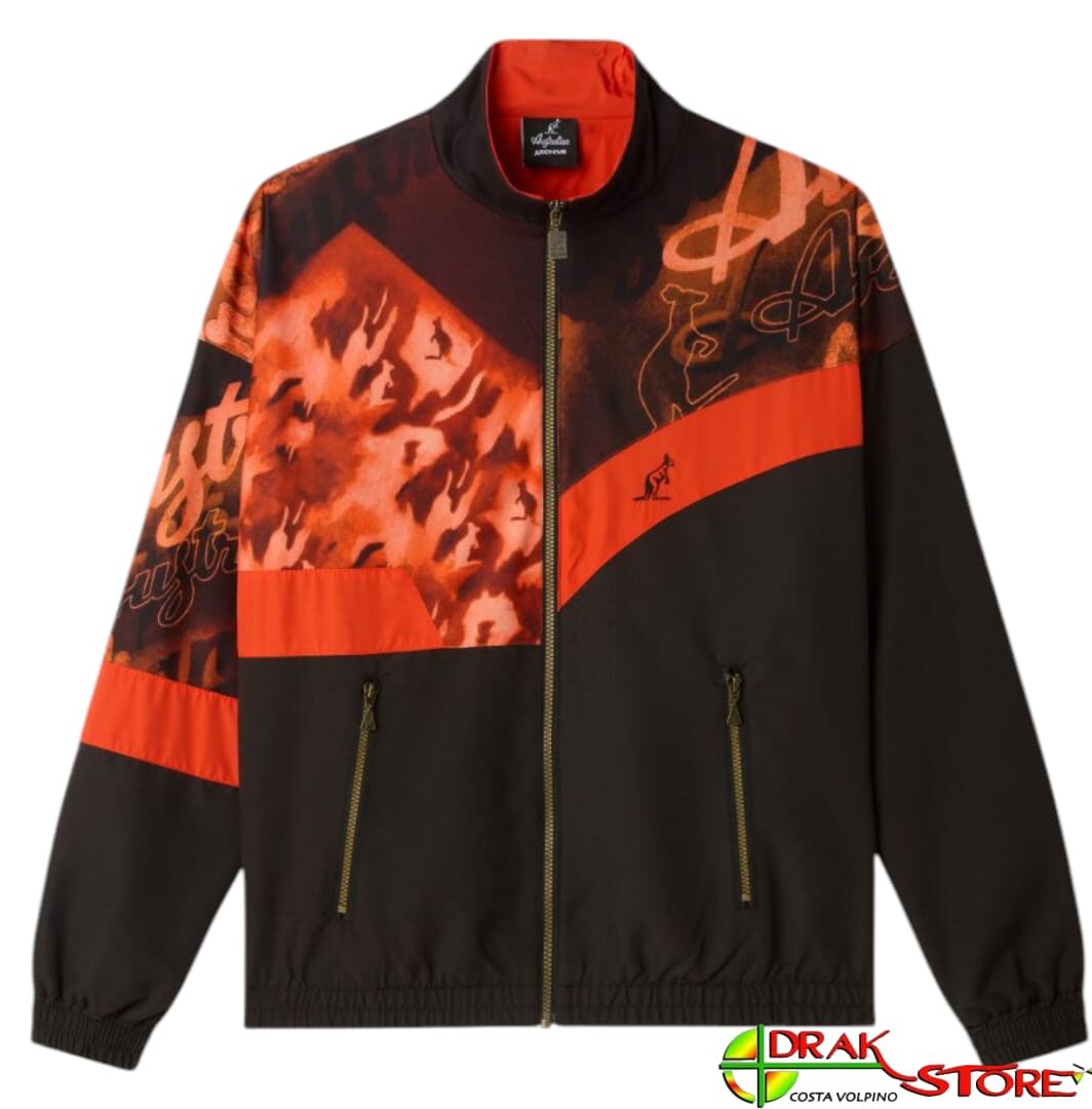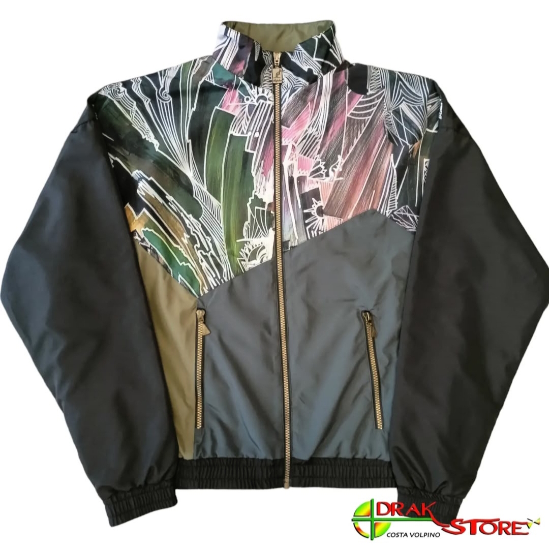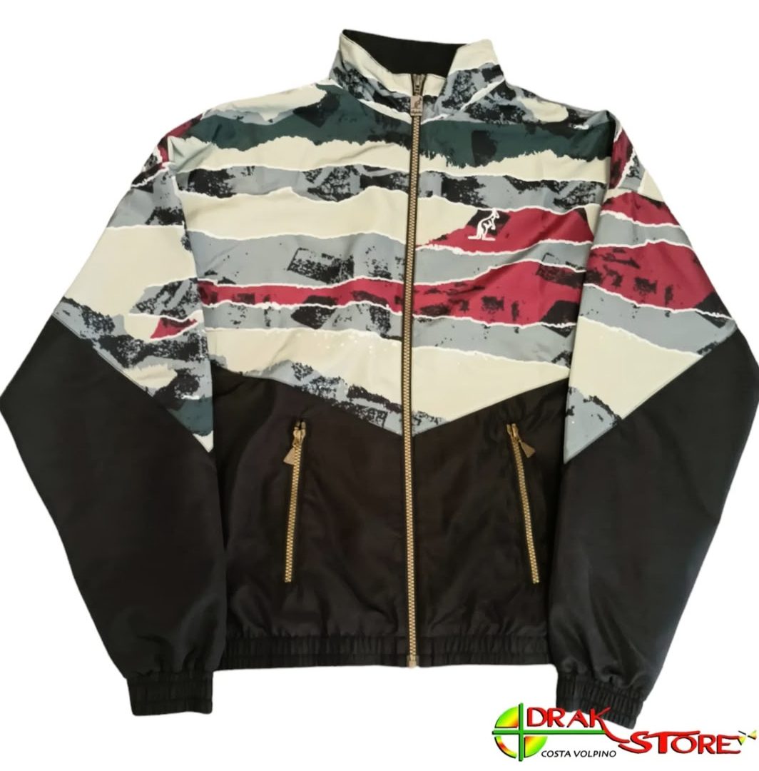 Giacca Australian ideale per gabber, a fantasia colori verde militare/bianco/rosa/giallo spezzata con inserti verde militare/grigio/nero , in tessuto tecnico super leggero foderato in rete (che la rende più leggera), logo “canguro” bianco ricamato sul cuore, zip frontale e alle tasche, elastico sul fondo e ai polsi. Composizione 100% poliestere.