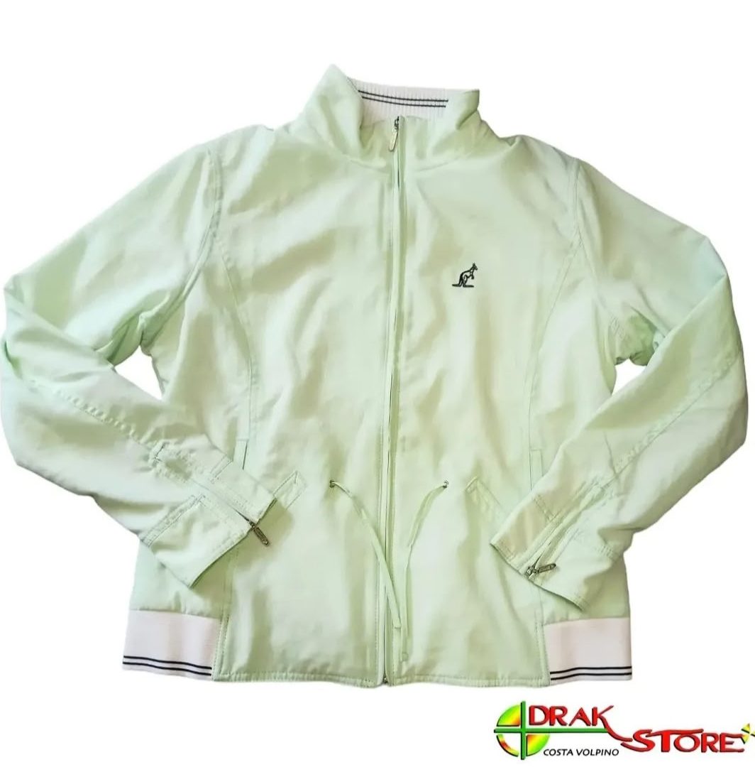 Giacca Australian da donna ideale per gabber, in tessuto tecnico foderato in cotone, bianca e nera con logo “canguro” oro ricamato sul cuore, stampa oro sulla schiena, zip frontale e alle tasche, vestibilità slim-fit / sciancrata. Composizione tessuto esterno 100% poliestere, fodera interna a contatto con la pelle 100% cotone.