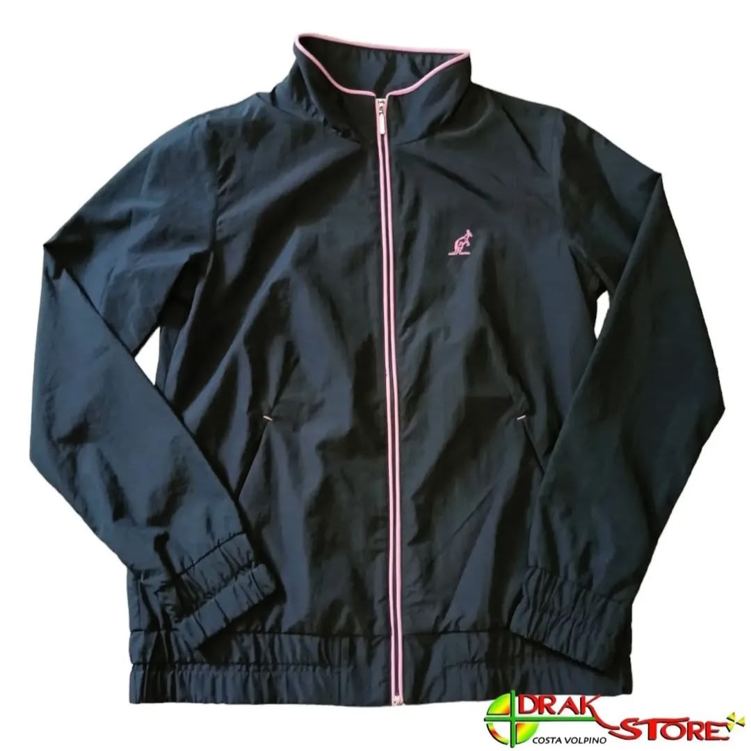 Giacca Australian da donna ideale per gabber, in tessuto tecnico blu foderato in micro rete, con logo “canguro” color lilla ricamato sul cuore, profili lilla, zip frontale e alle tasche, elastico sul fondo e ai polsi, vestibilità slim-fit / sciancrata. Composizione 100% poliestere.