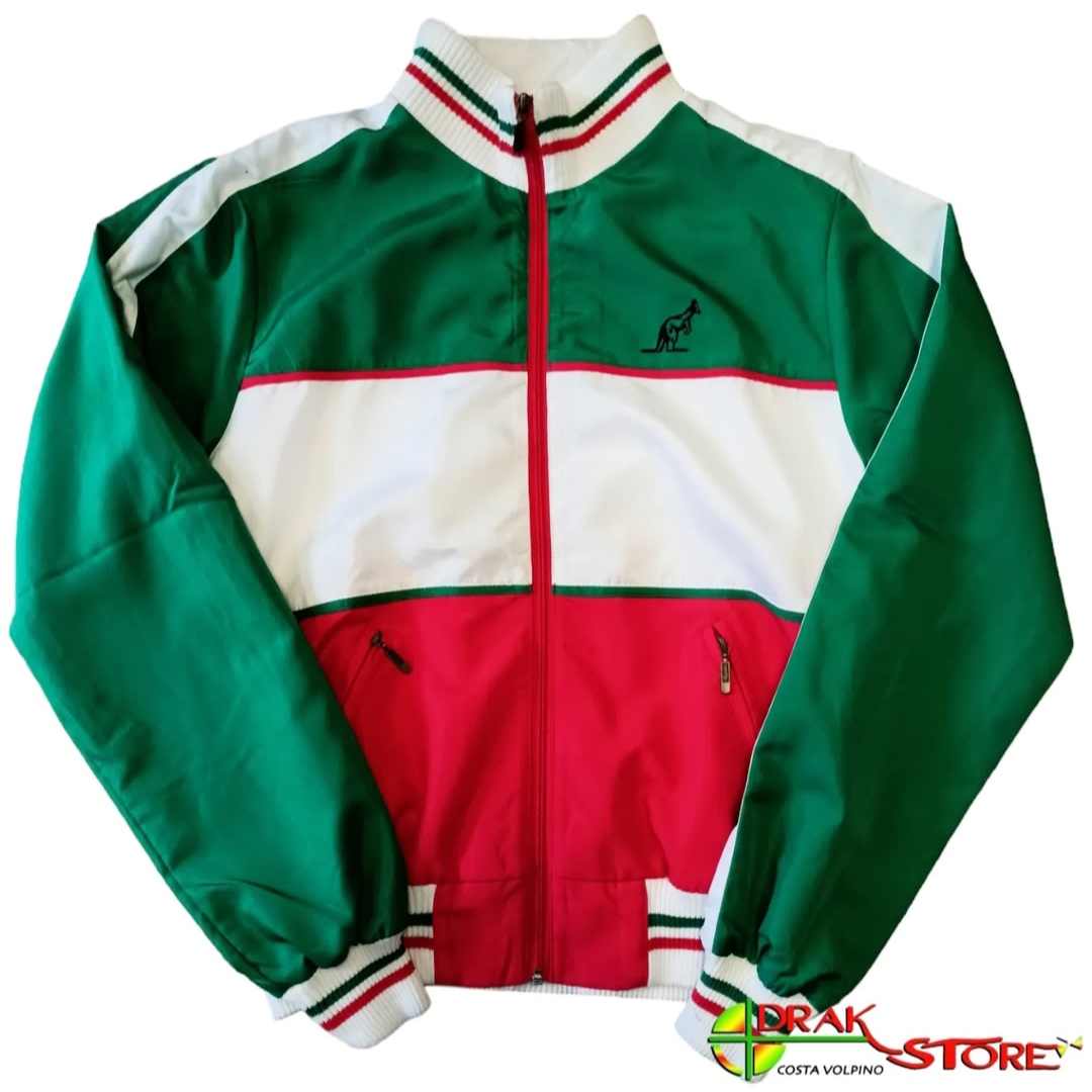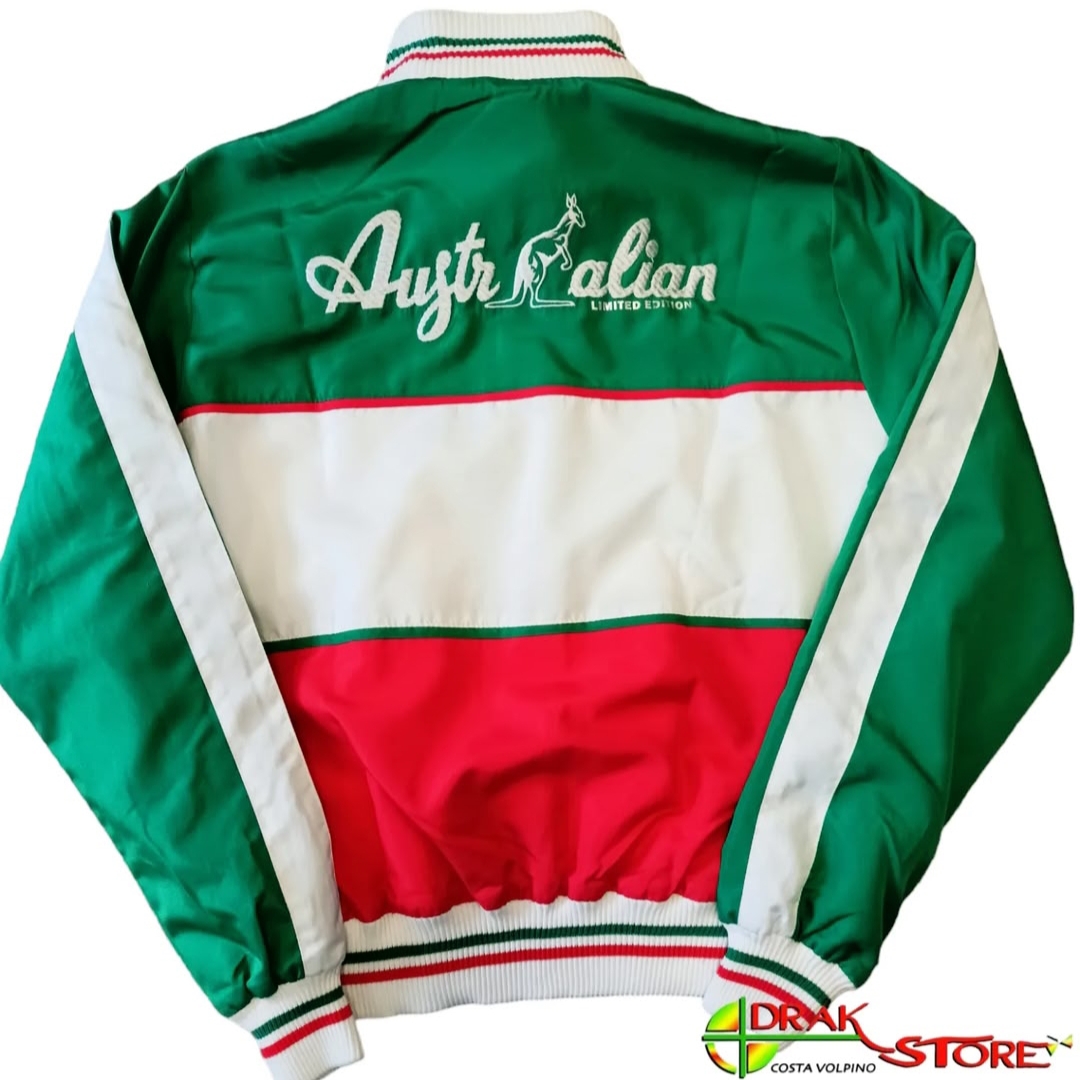 Giacca Australian Limited Edition ideale per gabber, in tessuto tecnico foderato in cotone, bianca/rossa/verde tricolore Italia, con logo “canguro” blu ricamato sul cuore, ricamo grande argento + lamina stampata argento “Limited Edition” sulla schiena, zip frontale e alle tasche, costina sul fondo, sul collo e ai polsi. Composizione tessuto esterno 100% poliestere, fodera interna a contatto con la pelle 100% cotone.