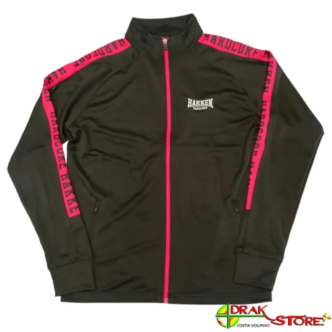 Giacca Hakken Hardcore in acetato color nero con bande sulle maniche rosse con scritte “Hakken Hardcore” nere, tasche con zip, logo “Hakken Hardcore” bianco ricamato sul cuore, costine ai polsi, cerniera frontale rossa in contrasto. Composizione 100% poliestere.