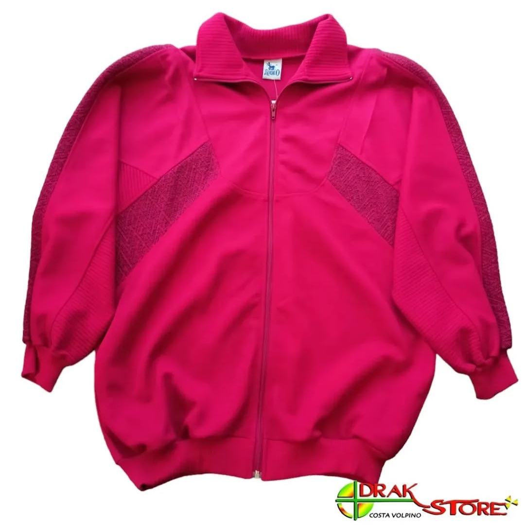 Giacca Rodeo By Gef originale anni ’90 ideale per gabber, in felpa color fucsia con inserti a trame lavorate, costina sul fondo e ai polsi, zip frontale. Composizione 100% acrilico.