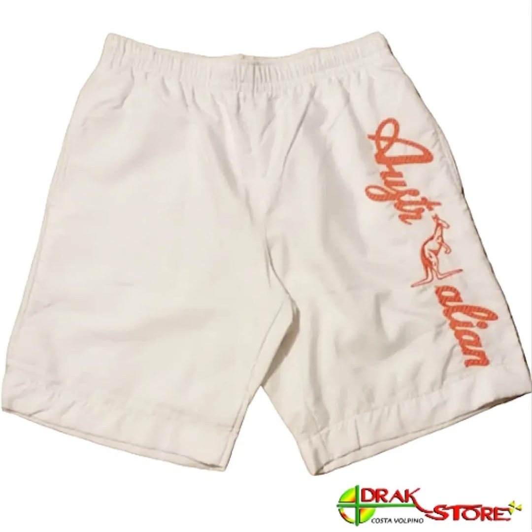 Pantaloncini corti / Shorts Australian in tessuto tecnico foderato in cotone, bianco con scritta “Australian” + logo “canguro” arancio fluo ricamata sulla gamba, tasche e elastico in vita con coulisse regolabile. Composizione tessuto esterno 100% poliestere, fodera interna a contatto con la pelle 100% cotone.