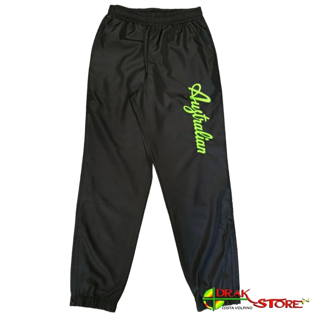 Pantalone Australian in tessuto tecnico foderato in rete (che lo rende più leggero), color blu con scritta “Australian” ricamata sulla gamba color verde fluo, elastico alle caviglie con zip che permette l’apertura a soffietto, tasche oblique, elastico in vita con coulisse regolabile. Composizione 100% poliestere.