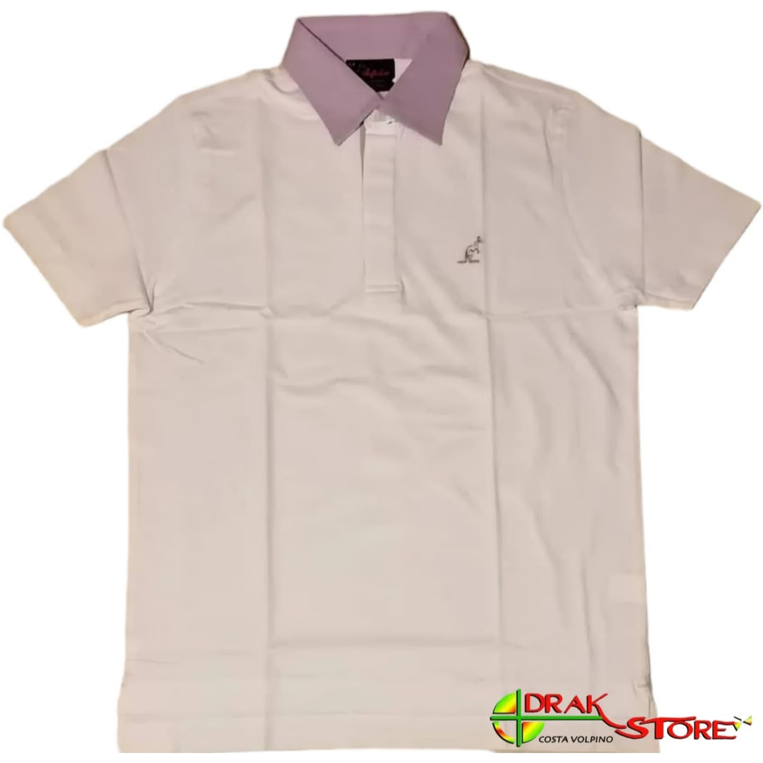 Polo Australian in cotone, tinta unita bianca, colletto lilla con parte sotto a fantasia floreale multi color, bottoni sul collo, ricamo lilla logo “canguro” sul cuore. Composizione 95% cotone 5% elastan.