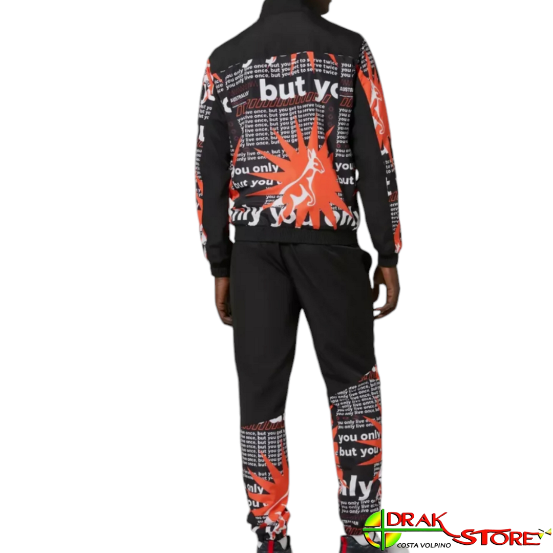 Tuta completa Australian a base nera, con inserti a fantasia bianca e arancione, realizzata con tessuto tecnico esterno, foderato in rete. La giacca presenta elastico in vita ed ai polsi, cerniera alle tasche. Il pantalone presenta scritta “Australian” ricamata sotto la tasca, elastico con coulisse regolabile in vita ed elastico alle caviglie. composizione 100% poliestere.