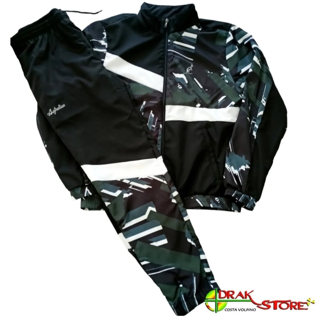 Tuta completa Australian a base nera, con inserti a fantasia bianca, verde militare e ottanio, realizzata con tessuto tecnico esterno, foderato in cotone. La giacca presenta logo “canguro” stampato sul cuore, elastico in vita ed ai polsi, cerniera alle tasche. Il pantalone presenta scritta “Australian” stampata sotto la tasca, elastico con coulisse regolabile in vita ed elastico alle caviglie. composizione 100% poliestere.